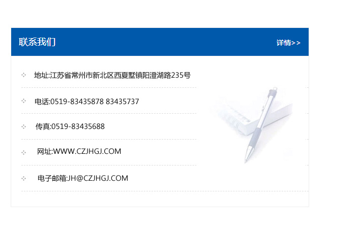 地址:常州市新北區友邦商務大廈1幢16、17層  電話:0519-85101652  傳真:0519-85112595  郵編:213022  網址:www.cz-jiayue_cn.jyj168.com  郵箱:xiajifengaa@163.com